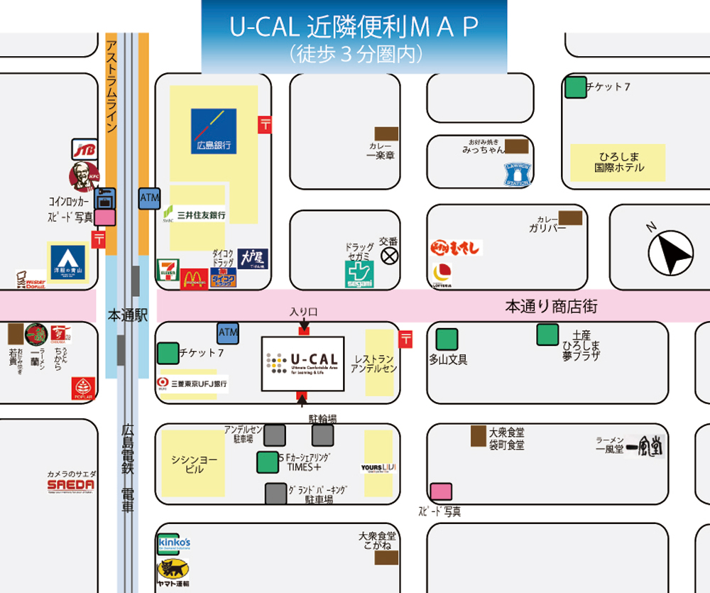 スタジオU-CALから徒歩3分圏【U-CAL近隣便利マップ】をご覧ください。